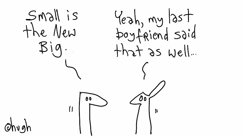 We need to reset our brains into thinking way (WAY) differently, way (WAY!) smaller. That’s not as easy as it sounds — 99% of us marketers have been wired (since the printing press and invention of advertising) to think the exact opposite of tiny. Screw tiny; bigger is better, buddy-boy:
